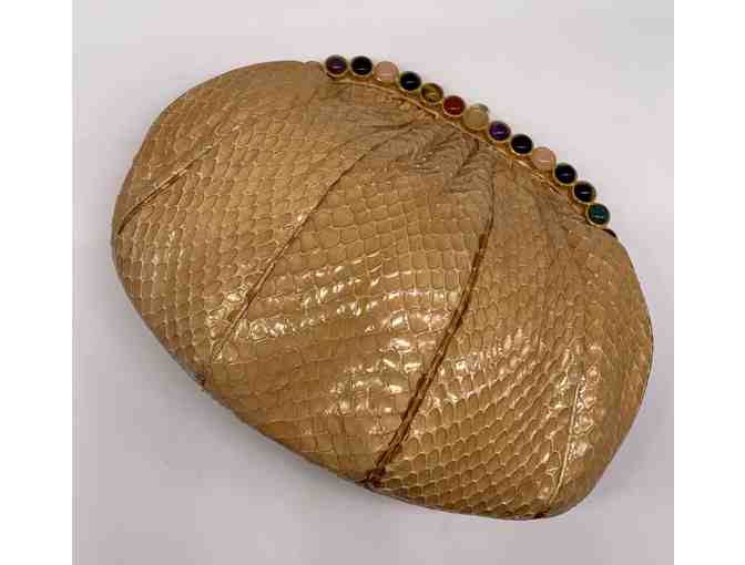 Judith Leiber tan snakeskin evening bag. Satin lining and gold tone hardware. Push lock top closure with embellishments. Well used.