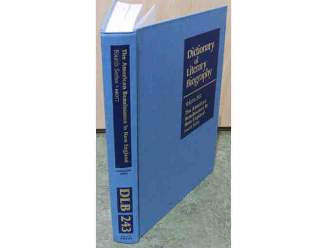 From the Dictionary of Literary Biography reference set by the Gale Group. The American Renaissance in New England. Volume 243. Edited by Wesley T. Mott. Gale Group, 2001. 467 pages. Hardcover with two-tone blue binding. Condition: Bottom of front cover has slight soil mark; top edge of book block has soil marks; otherwise clean, with clean pages. Contains biographies of 41 American writers, including Catharine Beecher, Orestes A. Brownson, Lydia Maria Child, Christopher Pearse Cranch, Emily Dickinson, Frederick Douglass, Isaac Thomas Hecker, Frederic Henry Hedge, Thomas Wentworth Higginson, George Perkins Marsh, Harriet Beecher Stowe, Jones Very, Noah Webster, and John Greenleaf Whittier. A nice reference to have at hand.