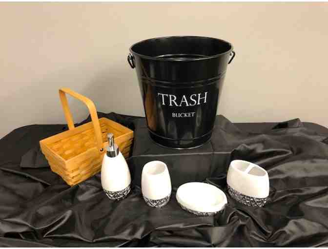 This modern set includes a liquid soap dispenser, soap dish, toothbrush holder, glass, w/basket. Black trach bucket is also included.
