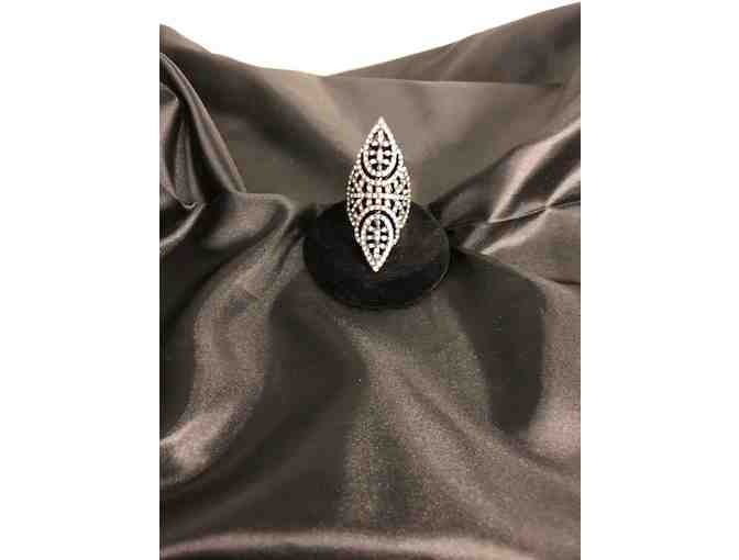 Art-deco inspired and crystal-embellished, this glittering hematite ring spans beyond knuckle to knuckle, measuring a full 2 inches long!