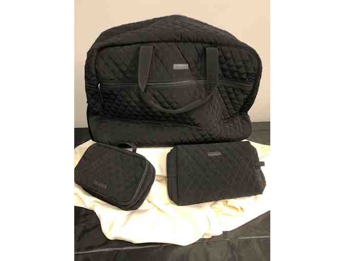 Vera Bradley Collection of travel accessories. Includes a Black Grand Traveler Bag, Black Large Cosmetic Bag, Black Blush and Brush Make Up Case.