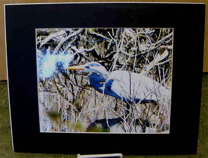 A vivid close-up photograph of a watery Great Blue Heron, as done by Terri Ackerman. The colors are brighter in person, and no flash-splash appears on the item. Photographed in the area of Concord, Mass., during the winter of 2013-2014. Print measures about 9.5 x 7.5 inches and is surrounded by a black mat, making the total 11 x 14 inches.