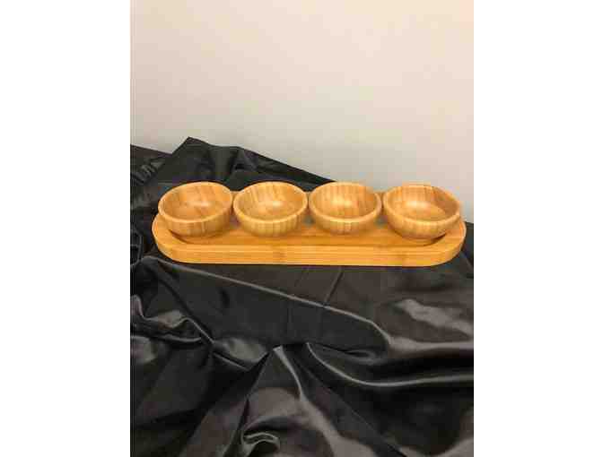 Serve in style with this Pampered Chef set of (4) four Bamboo Snack Bowls and Pampered Chef Bamboo Cracker tray.