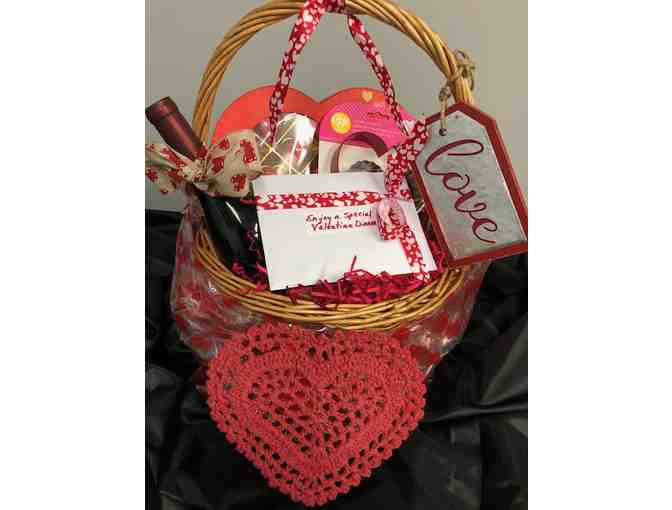 Included in this "Love Basket" is a Heart Towel, Estancia Wine, Heart Trivet, Box of Chocolates, Recipe Cards, $50 gift certificate for dinner (choice of 5 restaraunts).