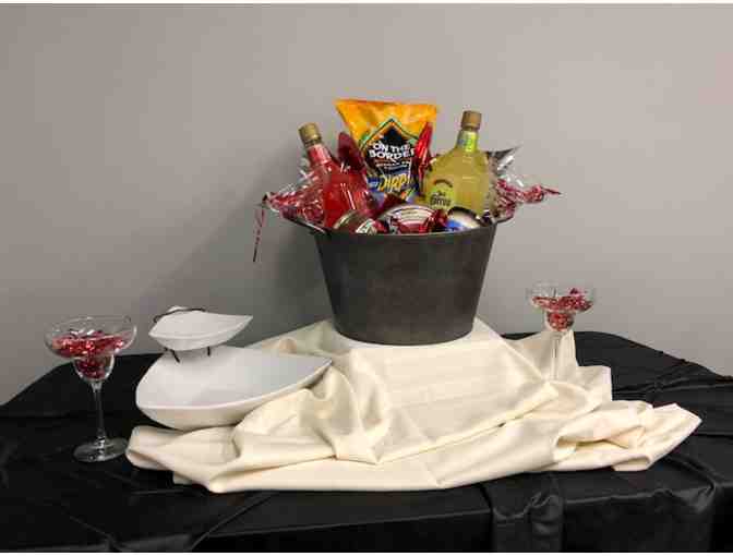 Invite your neighbors and have a Margarita party! This gift basket includes, 2-tier chip & dip server w/porcelain bowls & iron stand, Jose Cuervo ready to drink classic margarita & strawberry lime margarita, (4) margarita glasses, margarita salt, tortilla chips, salsa & queso. Galvanized metal beverage tub included.