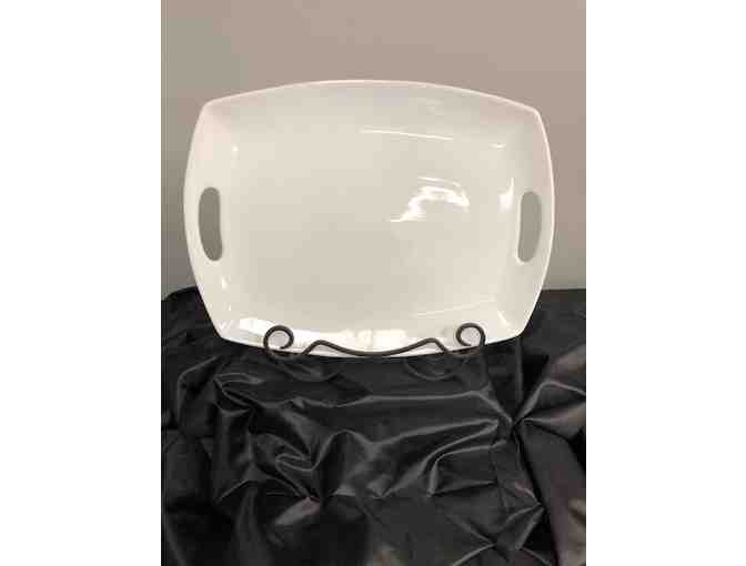 At your next family dinner use this simple white porcelain serving tray with handles to display your charcuterie food items.