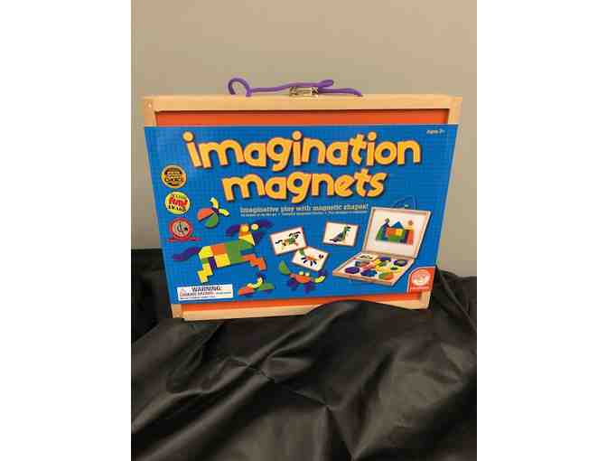 Imaginative play with magnetic shapes. Traveling case includes 42 well-crafted wood blocks and shapes plus 50 full-color designs to replicate. Inside panels of case are dry-erase marker ready.
