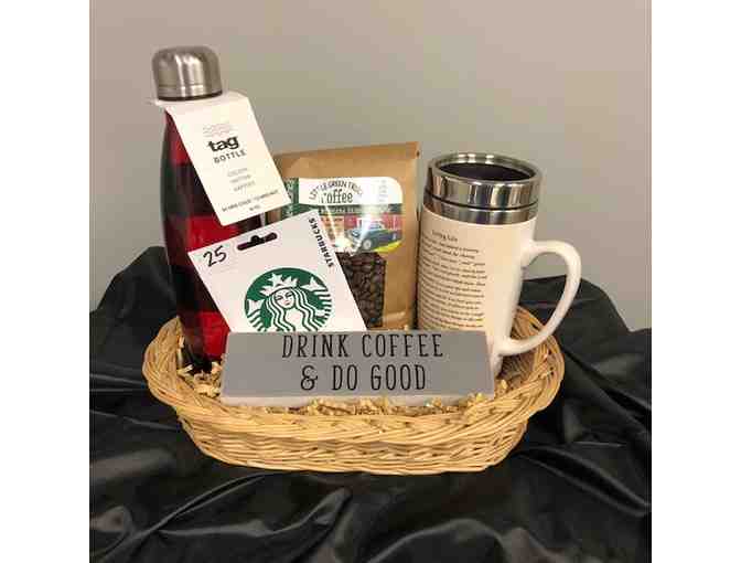 This basket includes "Tag" hot or cold beverage bottle, ceramic coffee mug, coffee beans, Starbucks $25 Gift Card, Sign: "Drink Coffee and Do Good"!