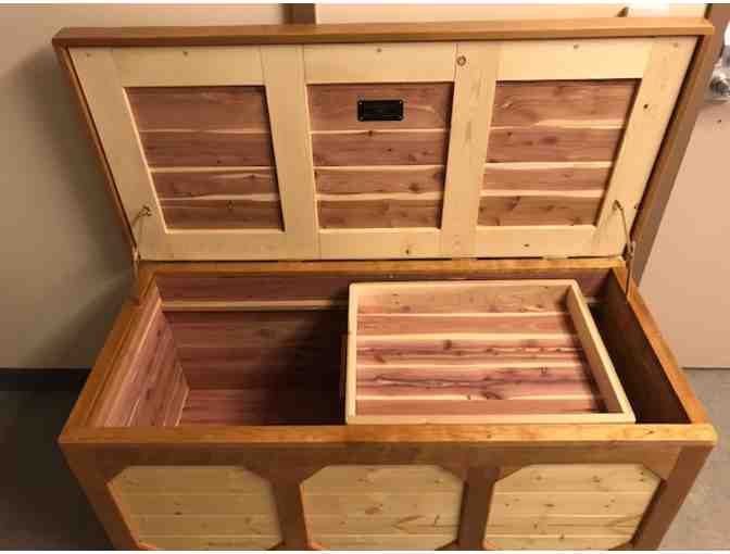 This one of a kind, beautiful wooden chest was built by Sweetwater County's own Paul McFadden. The handcrafted chest exterior is made with the combination of knotty pine and cherry wood. The gorgeous interior is crafted with aromatic red cedar.