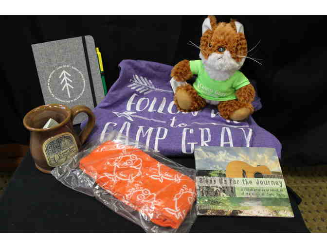 This basket is packed with all sorts of fun Camp Gray memorabilia. Includes: pottery mug, adult large t-shirt, "Bless Us for the Journey" CD, cozy cabin socks, journal and pen, and the Camp Gray fox stuffed animal.