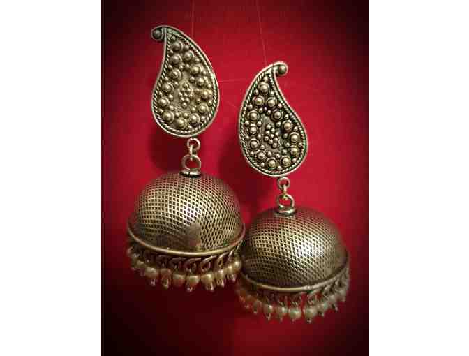 These unique oxidized silver earrings from India are called Jhumkas. These beauties can add character and charm to any of your outfits. They are lined with white stone (pearl like) droplets, giving them a chandelier appearance. Length - 4 inches. Another great accessory for your Bollywood night!