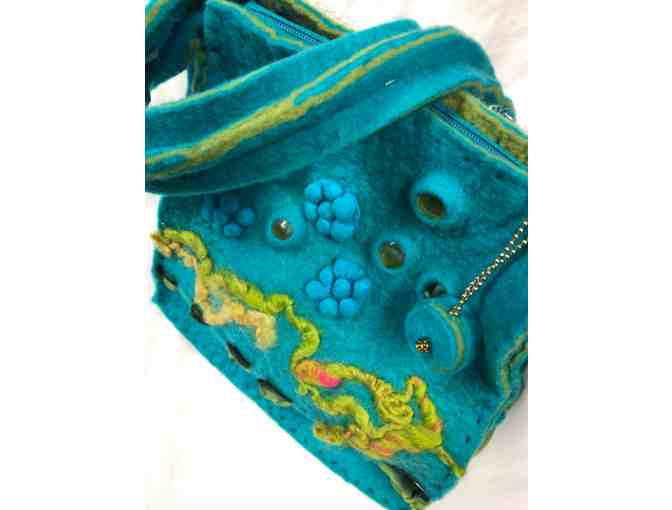 8.5" x 8.5" x 4.5" gusseted purse in teal and kiwi soft felt with top zip closure. Exterior surfaces adorned with multiple motifs, objects, textures and sheens. 26" strap perfect for over-the-shoulder use. Solid bottom and 4 artful 'feet'.