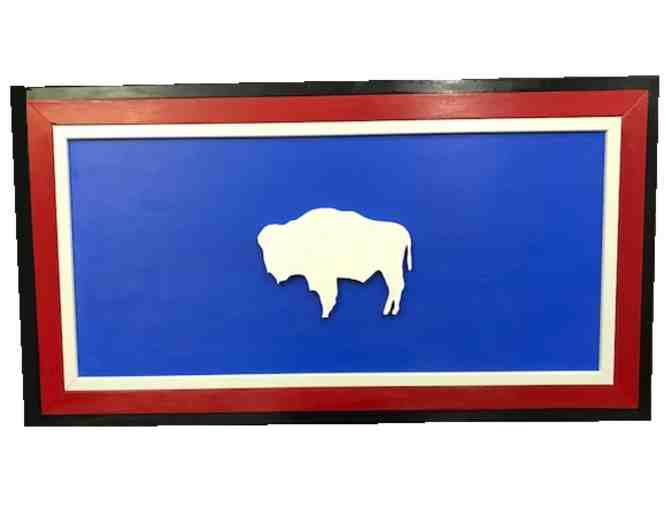 Custom built, this wooden Wyoming flag was made for the Red Tie Gala and would be the perfect fit for any Wyomingite looking to show their Wyoming pride.