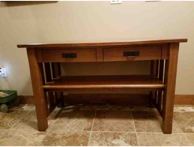 This beautiful Mission Style Table, inspired from a drawing in a 1906 Gustov Stickley catalog, was very popular in the early 1900s and is made from solid quarter sawn white oak. It was made using mortise and tenon construction with its legs completely coopered in keeping with the original style. The drawers are constructed using dovetail joinery from solid oak.