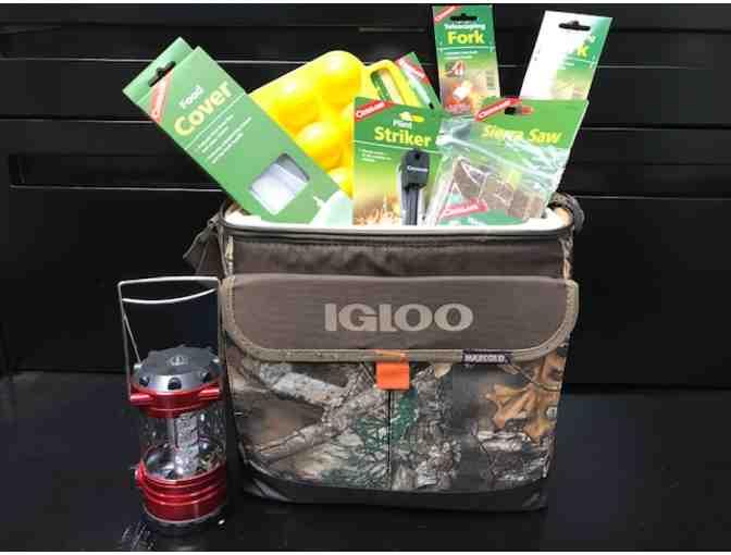 Be prepared to hang out outdoors with this cooler bag stocked with a lantern, flint striker, food cover, and more.