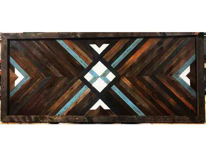 This gorgeous, rustic wooden piece is made of Wyoming reclaimed wood, cut with precise and perfect angles to create a beautiful abstract scene. It's perfectly sized to be a Queen sized bed headboard or a mounted wall display.