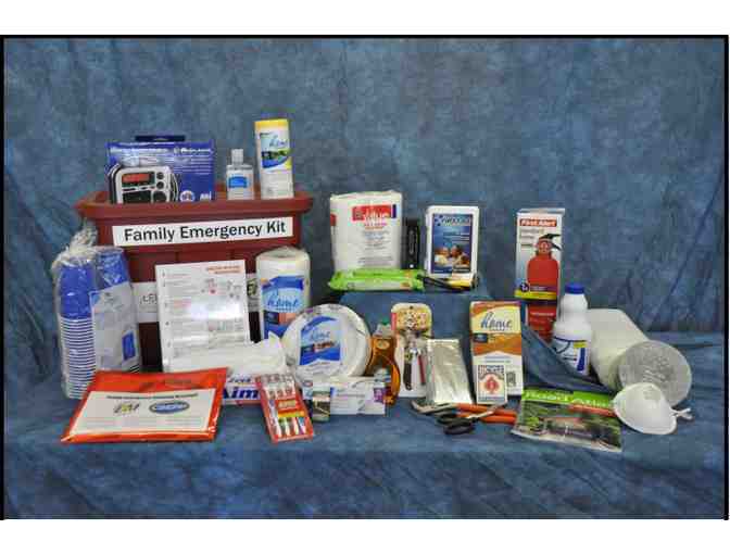 Prepare for any situation with this Family Emergency Kit. Kit includes First Aid Kit, AM/FM/Weather Radio, Fire Extinguisher, KNife, Can Opener, Dust Masks, Paper Towels, Plastic Bags, Utility Wrench, Hand Sanitizer, Flashlight, Cups, Plates, Eating Utensils, Toilet Paper, and Cleaning and Disinfecting Supplies.
