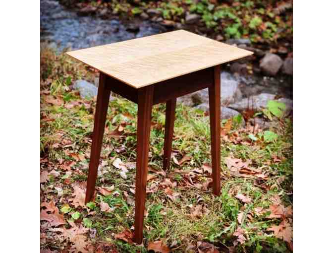 Handmade side table with handscraped birdseye maple top and black walnut top finished with hand rubbed tung oil.