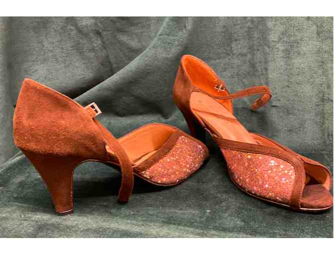 Dance the night away in a pair of stunning, size 9, Argentinian tango shoes! These beauties have 3" heels and are made by Scarperia Artesanal. They are brown suede and the sparkly bits are actually tiny stars. They are lightly worn and eager to step out with you in them!