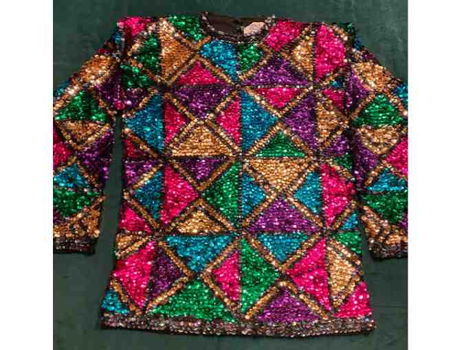 This sequined top is just the thing for adding some zing! to your next party. It's a Large, is slightly stretchy, and is hand washable.