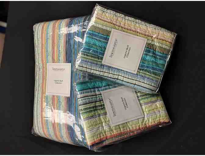 Queen Size 100% cotton quilt, shames and decorative pillow covers. Yarn dyed in stripes of cool blue, yellow, peach, and green.