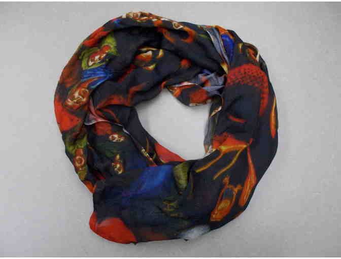 Music inspired scarf featuring musicians and musical instruments. Wonderful variety of colors!
