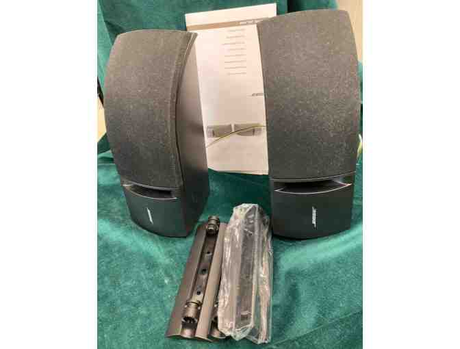 These speakers, Bose 161, are 11" tall, and the original manual is provided for you. There are two wall mounts also included, mounts that allow you to swivel the speakers through about 60 degrees.