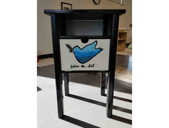Featuring the fingerprints of the children and a peace dove, this adorable side table to sure to liven up any room in your home. Created by Ms. Elizabeth, Ms. Montana and the children in the classroom.