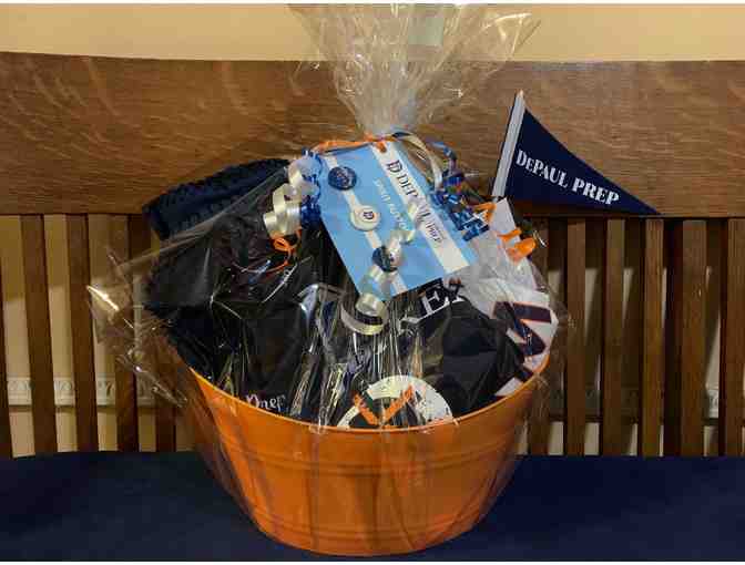 DePaul Prep Swag Basket Swag basket contains a fleece blanket, 2 pairs of socks, drawstring bag, a winter hat, car magnet, stickers, spirit buttons and pennant!