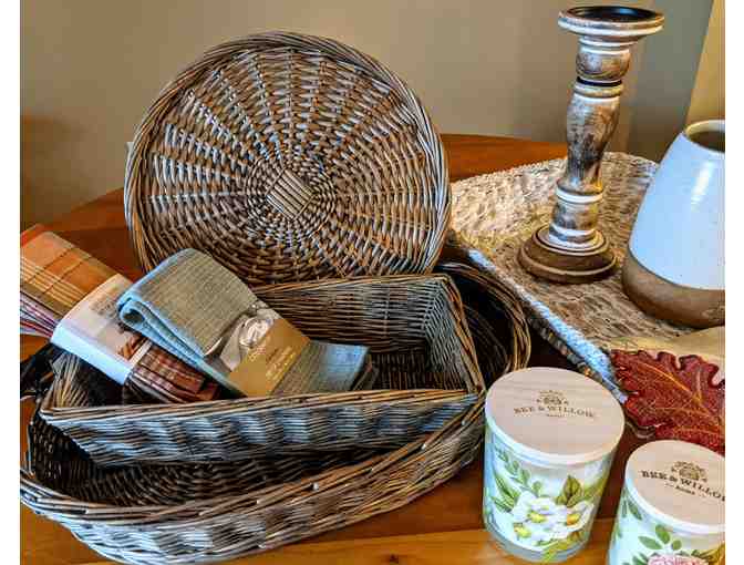The finishing touch to a beautiful house! Three wonderful Wicker baskets, two sensuous Bee & Willow jar candles, colorful cloth napkins and more!