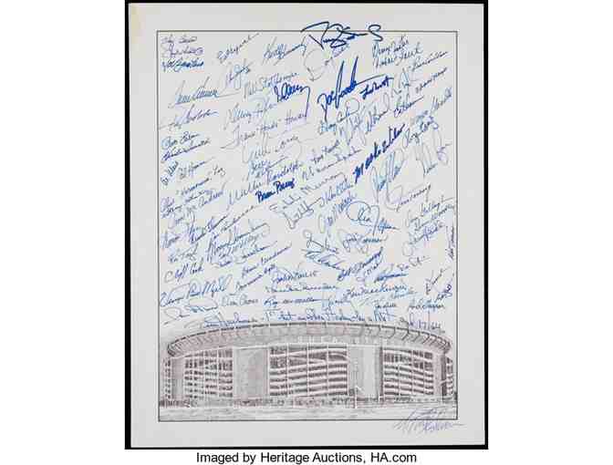 New York Mets All Time Greats Autographed Oversized Photograph. Offered is a beautiful 16" x 20" photograph featuring over 50 signatures of New York Mets Greats. Highlights include Nolan Ryan, Tom Seaver, Dwight Gooden, Keith Hernandez, Gary Carter, Mookie Wilson, Mel Stottlemyre, Willie Randolph, Duke Snider, Jerry Koosman, Eddie Murray, Warren Spahn. Yogi Berra, Tug McGraw, Darryl Strawberry, George Foster, Roger Craig, and many more. Certificate of Authenticity.