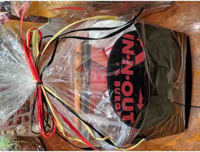 A basket of swag donated by In-N-Out including a hat, socks, puzzle, pen, cup and four (4) complimetary meals at In-N-Out.