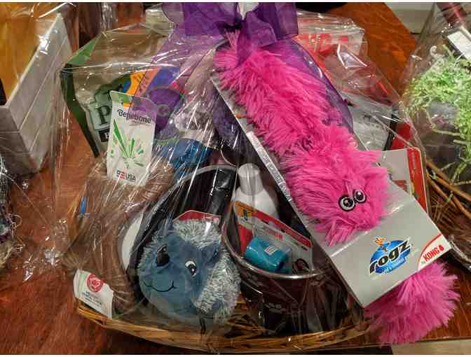 A basket of doggie swag donated from KONG including food, toys, toiletries and more!