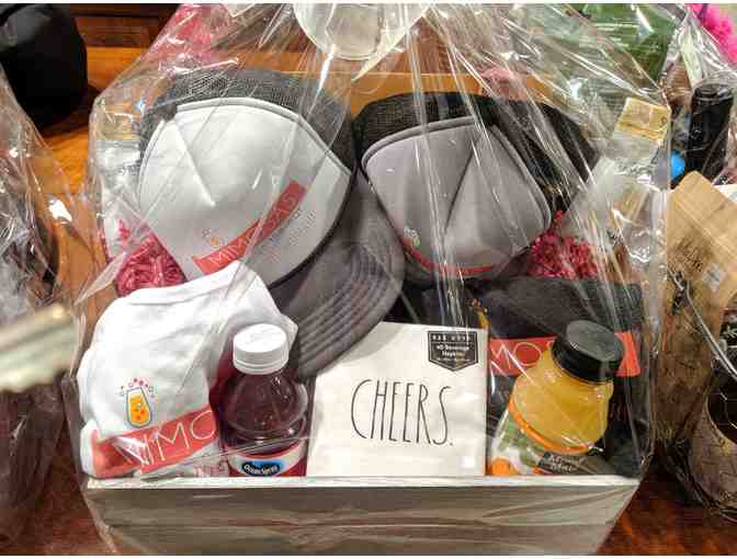 A Gift Basket including two Mimosas on the Mat tank tops, two Mimosas on the Mat trucker hats, two bottles of sparkling wine (Mumm Rose & Coppola Sofia Blanc De Blancs) with mimosa mixers and two champagne flutes.