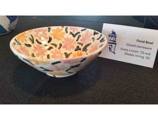 Made by Berwick Academy students Greta Lincoln '20 and Maddy Vining '20. Floral-design stoneware bowl in shades of pink, yellow, and black.