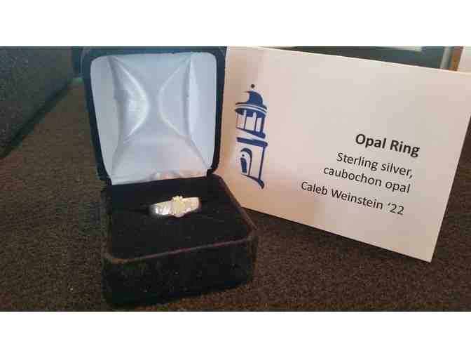 Made by Berwick Academy student Caleb Weinsten '22. Handmade sterling silver ring with a teardrop opal cabochon in a basket setting. The ring is size 6.