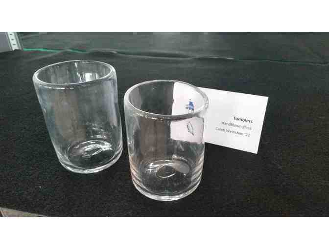 Made by Berwick Academy student Caleb Weinsten '22. Handmade glass blown tumblers, clear, set of 2. Made in collaboration with Caleb's instructor at Salt and Sand Studios in Warren, VT. Not suitable for hot liquids, as the tumblers can break due to thermal shock. Available for pickup May 1, 2020.