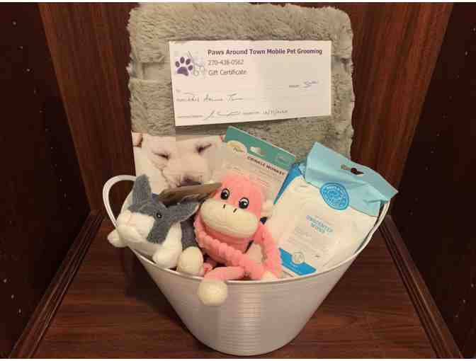 This basket includes not only a gift certificate for a mobile pet grooming, but some supplies you need for your special pup!