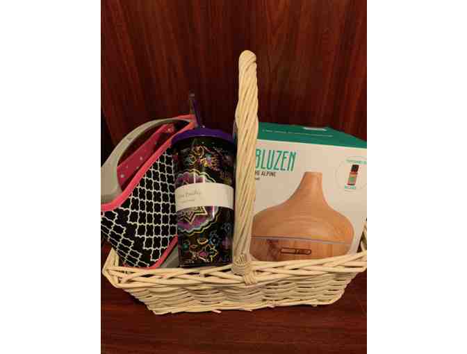 Needing a quiet weekend at home? This gift basket features an essential oil diffuser, small cooler to chill your beverage, and a tumbler!