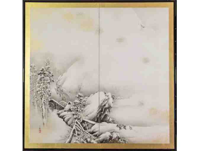 Pair of two panel Asian screens, predominately in black and white. Landscape scenes with gold dust. Made of paper and wood. Each is 67.25”h x 74.5”w.