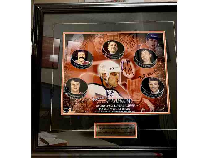 Honoring Rick Tocchet, this autographed poster is from the Philadelphia Flyers Alumni Golf Classic & Dinner in 2003. It features autographs from NHL legendary Hall of Famers, Wayne Gretzky, Bernie Parent, Bobby Clarke, Bill Barber, and Paul Coffey.