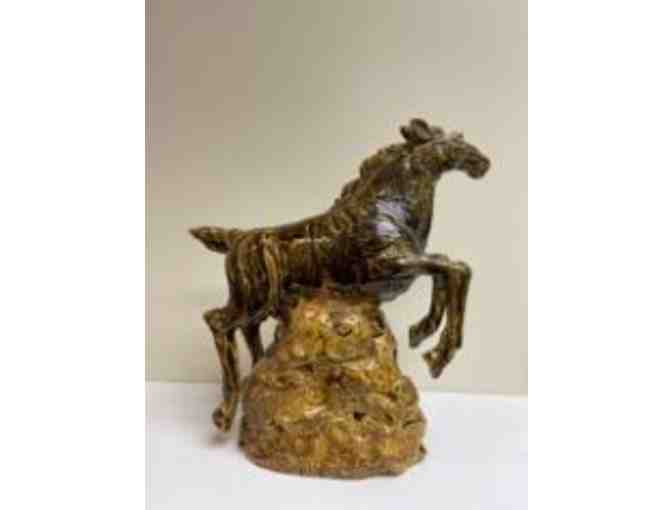 A fine older handmade and hand-painted Galloping Horse ceramic sculpture. The ceramic animal has finely detailed ears, eyes, mouth, muscular back, legs, and hand-painted in attractive white and cream colors. The well crafted sculpture is heavily potted, a very substantial work of art.