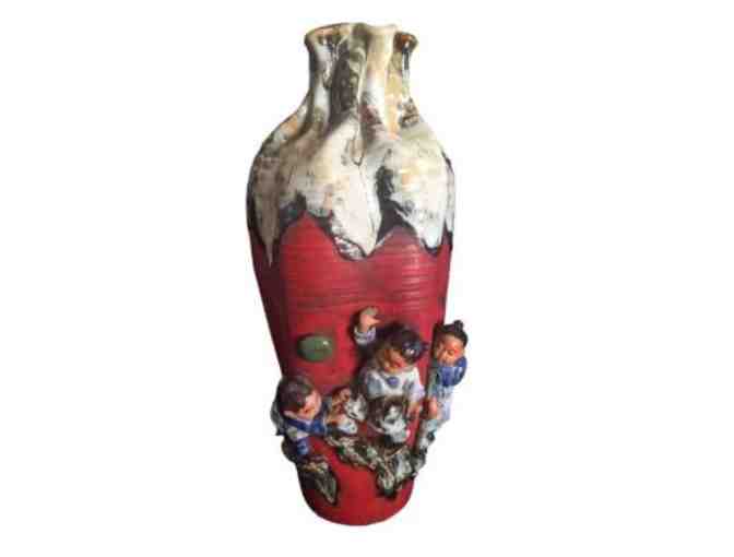 A tall handmade Folk Art pottery vase from Japan's early 20th century Sumida ware depicting three rambunctious children playing ball. Signed Ryosai in a white glazed gourd shaped lower section Beautifully handmade, hand-painted and hand flambé glazed with a pinched style mouth and with glorious images of the children.