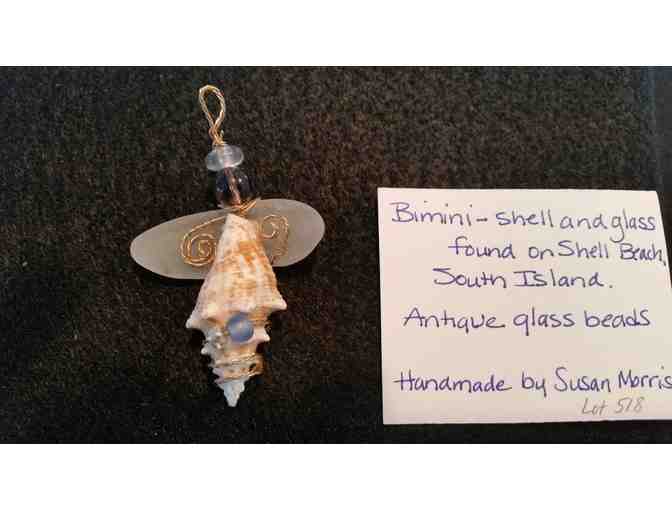 This beautiful angel is crafted of shell and clear seaglass found at South Island, Bimini. Antique glass beads and gold wire complete this lovely artwork. Wear it, hang in a window, or use to decorate a wreath or tree.