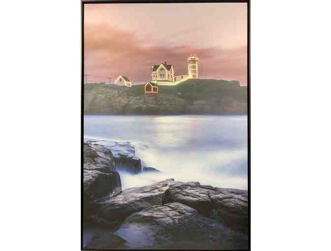 20" x 30" photograph of Maine's iconic Nubble Lighthouse by Newmarket, NH based JB Parrett. Photograph is mounted on canvas with a wooden frame.