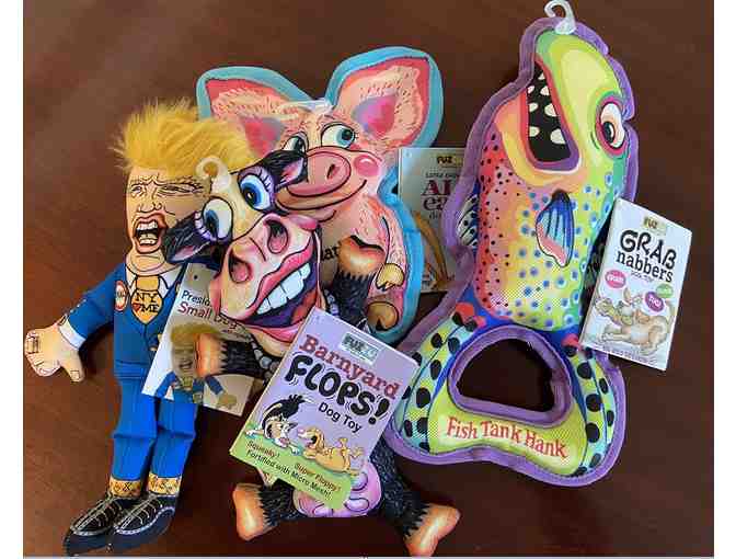 Four colorful, rugged, and humorous canvas and plush pet toys designed in Vermont for dogs. Some political figures, some non-political.