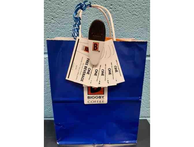 A Biggby Coffee donation consisting of a Sustain cup/lid, 2/5 ounces of Chocolate Covered Espresso Coffee Beans, 12 ounces of French Roast Coffee and 5 coupons for One Free Beverage.