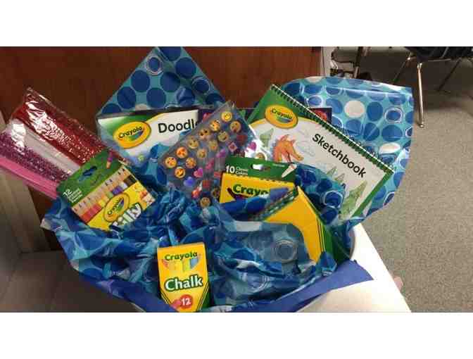 Bring out the budding artist in your child with this fun basket of craft items including a sketchbook, crayons, markers, chalk, colored pencils, stickers and more.