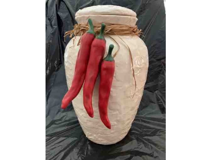Perfect for your kitchen or southwest decor! This ceramic jar with a lid is a beautiful accent piece - approximately 18" high and 13" it its widest point. Don't miss the opportunity to own this one-of-a-kind art piece from Taos, New Mexico!