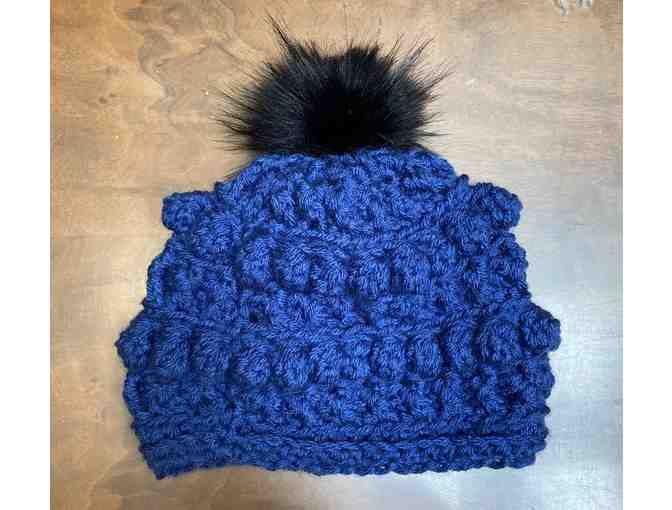 Blue adult size beanie with faux fur pom pom crocheted by Synergy parent, LaNeisha. Super cute!